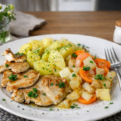 1 Hotovo | Oloupeme všechnu zeleninu. Žampiony očistíme a pokrájíme na kostky. Stejně tak brambory a petrželový kořen a cibuli posekáme na kousky. Do jednoho kastrolu dáme lžíci ghí (nebo másla) a necháme rozpustit. Přisypeme cibuli a necháme zesklovatět. Pak přisypeme petržel a ještě chvilku restujeme. Zalijeme vývarem nebo vodou aby petržel těsně zakrývala a uvaříme doměkka. |