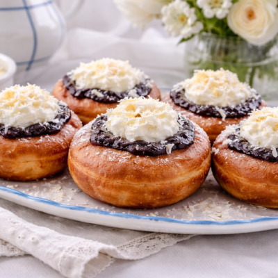 1 Hotovo | Do mísy nalijeme vlažné mléko, přidáme rozdrobené droždí, cukr a promícháme. Necháme 10 minut stát, aby se droždí zaktivovalo. Přidáme mouku, sůl, vejce a rozpuštěné máslo. Promícháme ve vláčné, spíš trošičku tužší těsto, které se nelepí k misce. Ideálně nám v tom pomůže kuchyňský robot. Hotové těsto necháme hodinu kynout, až zdvojnásobí svůj objem. |