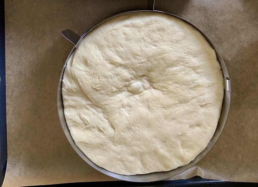 3 Hotovo | Dortovou obruč (příp. dortovou formu o průměru 23 cm) nastavíme na 20 cm a položíme na plech na pečící papír. Vymažeme olejem. Z těsta vyválíme placku o velikosti průměru formy a placku tam položíme. Těsto vytáhneme tak, aby bylo po celé ploše rovnoměrně. Formu zakryjeme fresh fólií a utěrkou a necháme hodinu kynout. Asi po půl hodině zkontrolujeme, jestli kyne rovnoměrně a příp. vyrovnáme. |